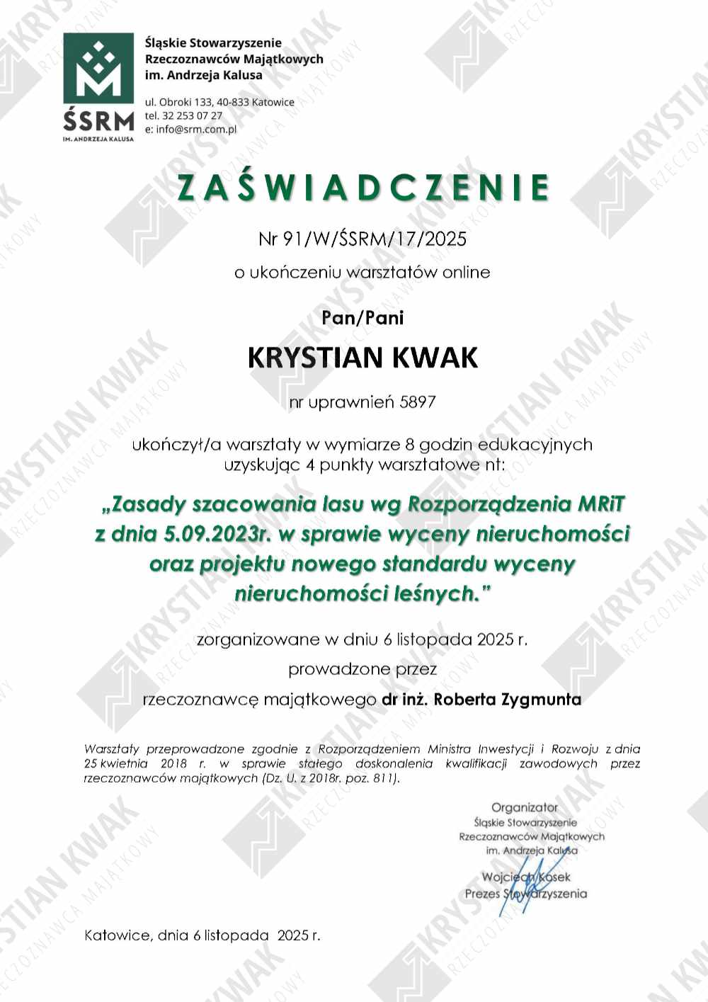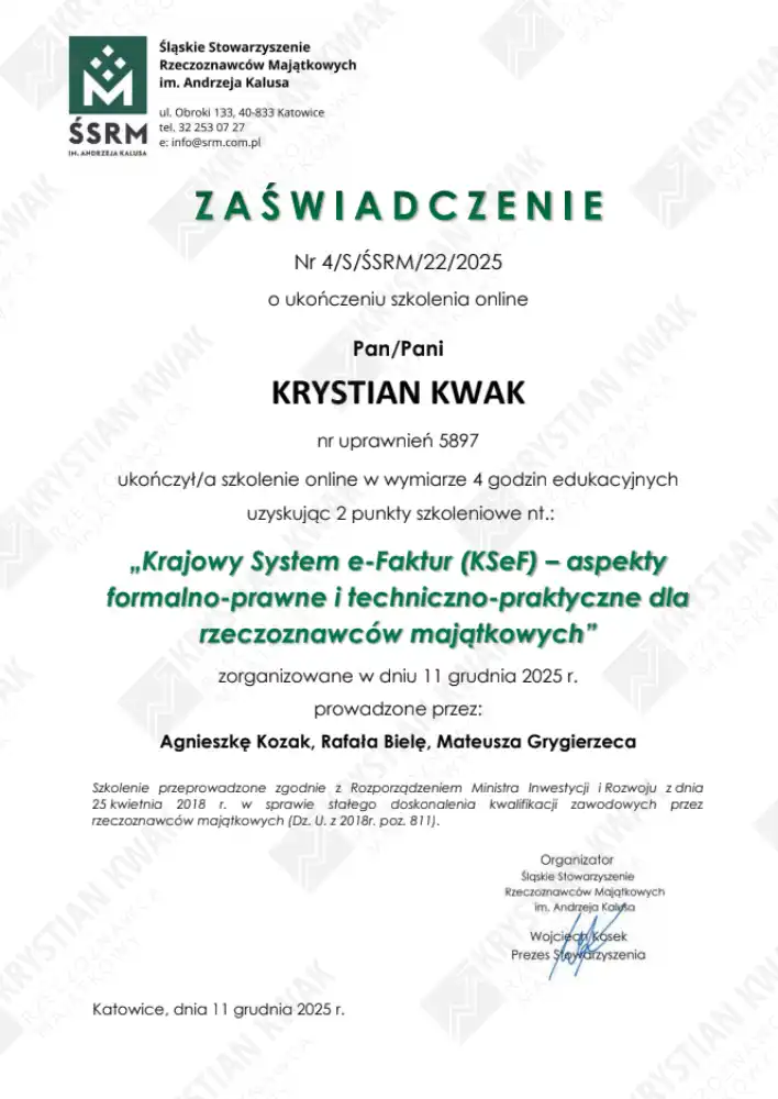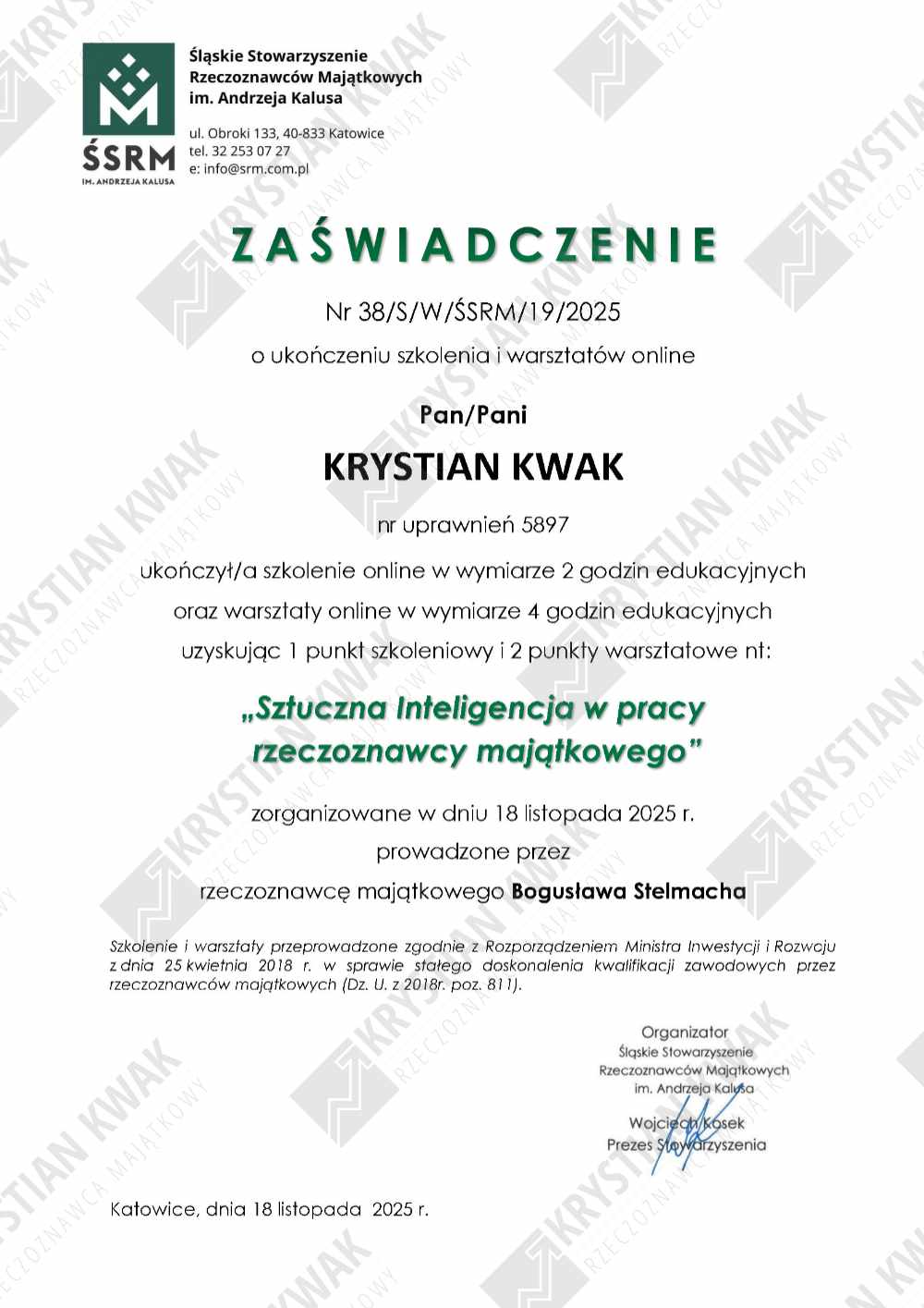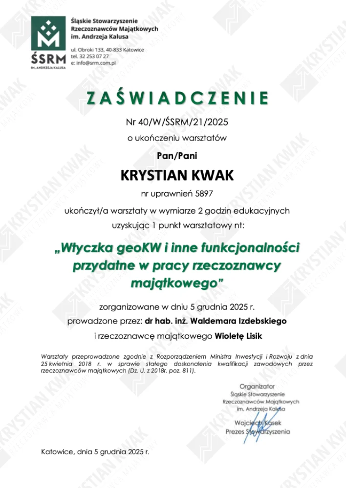Jestem rzeczoznawcą majątkowym posiadającym uprawnienia zawodowe nr 5897 w zakresie szacowania nieruchomości nadane przez Ministra Infrastruktury i Rozwoju. Z dniem 12 maja 2014 r. zostałem wpisany do Centralnego Rejestru Rzeczoznawców Majątkowych i z tym dniem nabyłem prawo do wykonywania zawodu. Ponadto od 2016 roku pełnię funkcję biegłego sądowego przy Sądzie Okręgowym w Bielsku-Białej z zakresu szacowania nieruchomości.