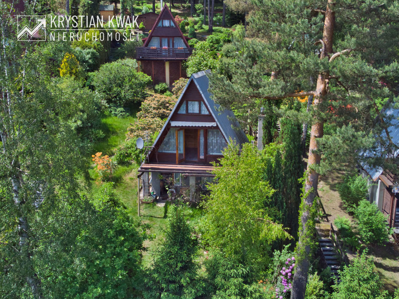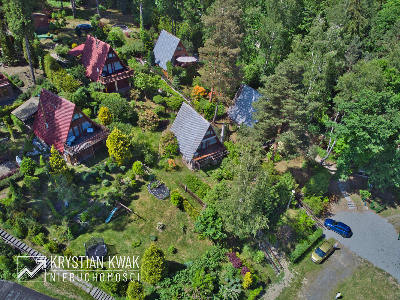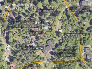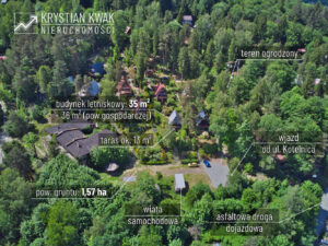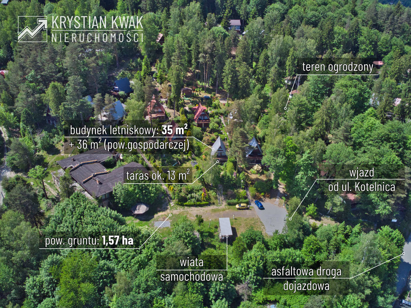 Teren o łącznej powierzchni 1,57 ha zabudowany jest 9 drewnianymi budynkami letniskowymi typu Brda oraz budynkiem wczasowo-kolonijnym (obecnie w stanie do rozbiórki). Teren w całości ogrodzony z urządzonym wjazdem od strony północnej (ul. Kotelnica), dwuskrzydłowa brama i furtka stalowa umożliwiające wygodną komunikację. We wschodniej części nieruchomości urządzony częściowo utwardzony parking dla samochodów osobowych, dodatkowo do użytkowania przez nabywcę przeznaczona jest drewniana wiata samochodowa, pokryta blachą, utwardzenie wykonane z płyt betonowych. Domek otoczony jest starannie zagospodarowaną zielenią: trawnikiem oraz licznymi nasadzeniami drzew i krzewów ozdobnych, które tworzą przyjemne, naturalne otoczenie. W ogrodzie znajdują się także miejsca do wypoczynku na świeżym powietrzu, idealne do relaksu i spędzania wolnego czasu.