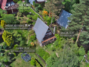 Budynek letniskowy o powierzchni ogólnej kondygnacji nadziemnych 35 m² oraz powierzchni gospodarczej 36 m² w postaci piwnic. Domek w zabudowie wolnostojącej, parterowy z poddaszem użytkowym, podpiwniczony. Konstrukcja budynku drewniana, dach dwuspadowy o konstrukcji drewnianej, pokryty blachą trapezową. Budynek został wybudowany w latach 80-tych. Wyposażenie w media obejmuje: energię elektryczną (w tym instalację 3-fazową), wodę (ze studni głębinowej, zasilającej hydrofornię, która grawitacyjnie spływa do poszczególnych domków; brak jest, niestety, wody w sezonie zimowym ze względu na nieprzygotowaną pod tym kątem instalację), ścieki sanitarne odprowadzone do kanalizacji gminnej.