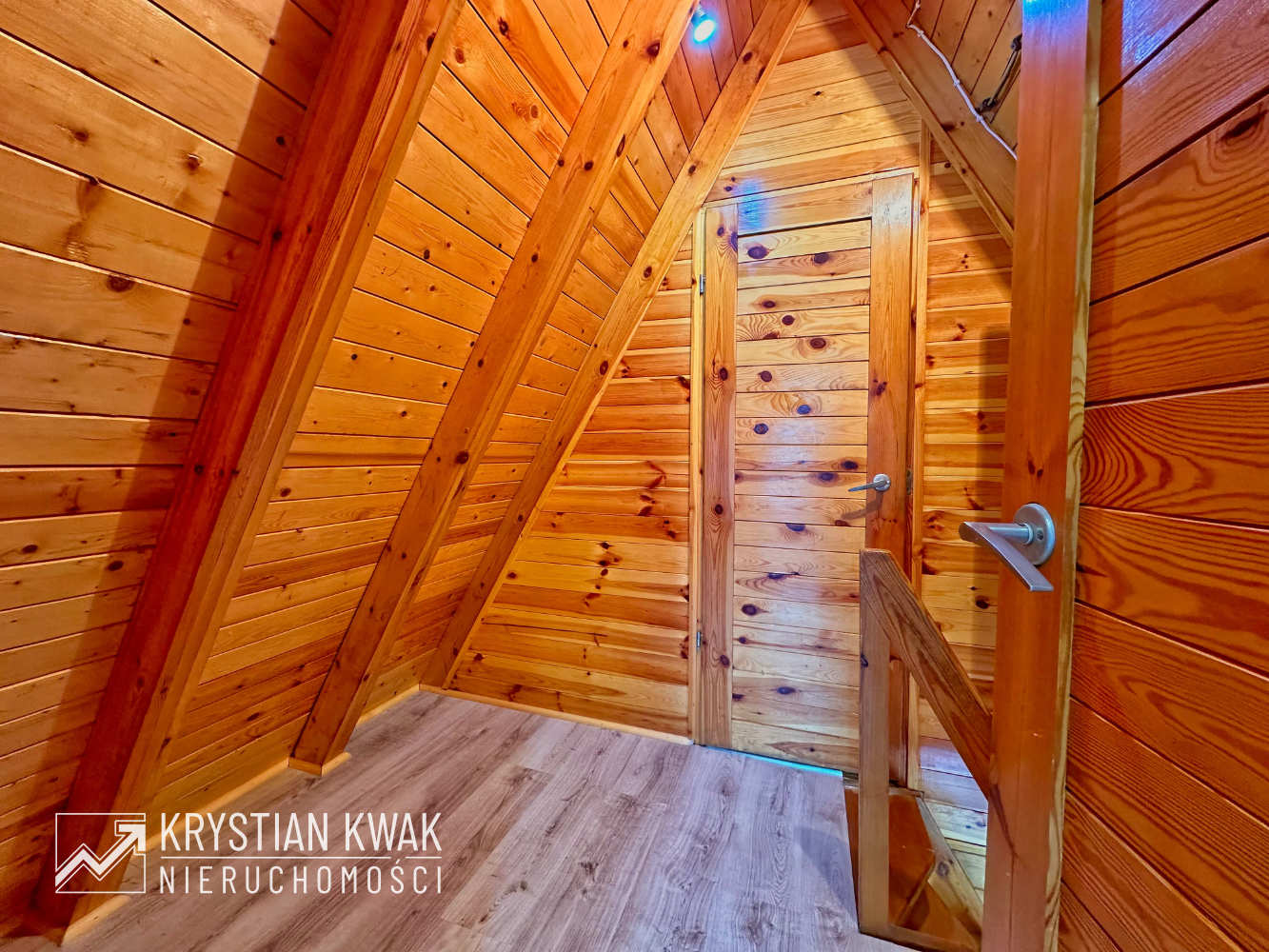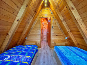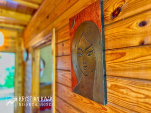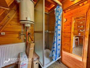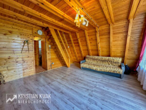 Układ funkcjonalny na parterze to: przedpokój, kuchnia, łazienka, pokój dzienny z tarasem (z cudownym widokiem na jezioro i otaczającą zieleń); na poddaszu: przedpokój, 2 sypialnie, ponadto w poziomie piwnic pomieszczenie gospodarcze pod całym budynkiem. Dodatkowo do budynku od strony wschodniej przylega tras o powierzchni ok. 13 m² (do wykończenia) z rozwijaną markizą, która przyda się w bardziej słoneczne dni.