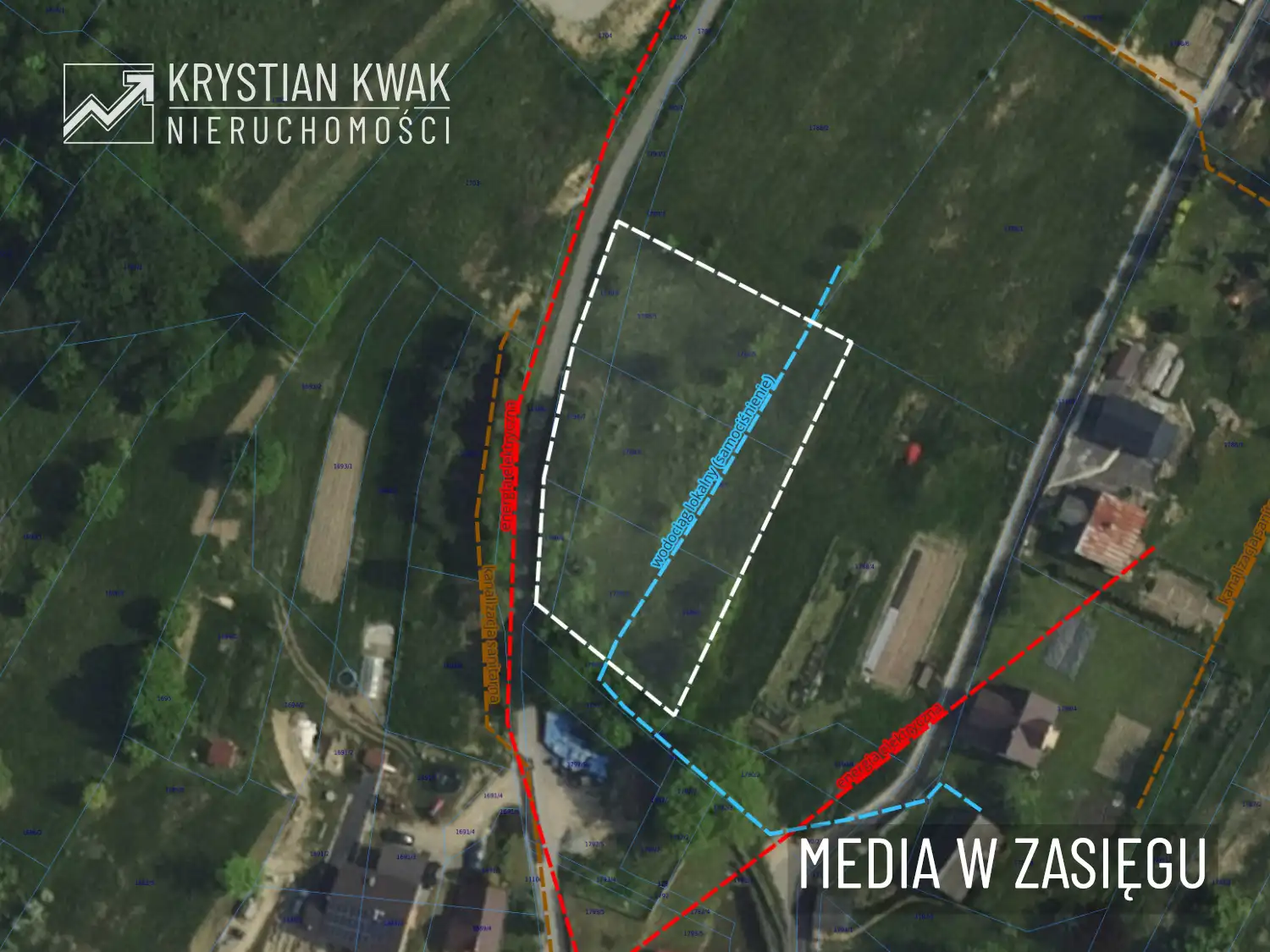 - Wodociąg (W): brak, w najbliższej okolicy nie ma wodociągu gminnego, konieczne jest wykonanie studni głębinowej, niemniej wzdłuż wschodniej części nieruchomości biegnie lokalny wodociąg zasilający budynki poniżej, na który należy zwrócić uwagę przy wykonywaniu prac budowlanych,