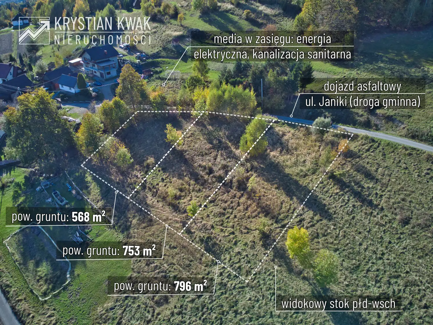 - Teren: o nachyleniu południowo-wschodnim z widokiem na Beskid Żywiecki, nieogrodzony