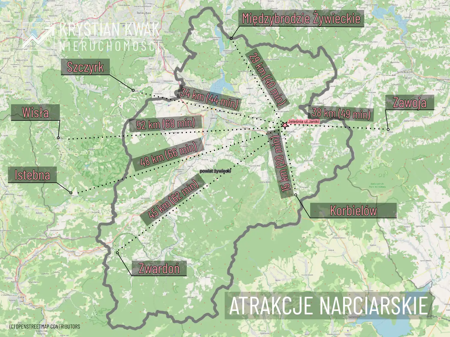 - Komunikacja: ok 20 min do centrum powiatu żywieckiego (miasto Żywiec) oraz 29 min do węzła drogi ekspresowej S1