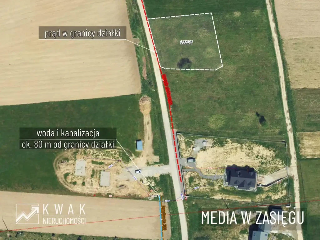 - Prąd (E) – w drodze, wzdłuż granicy działki